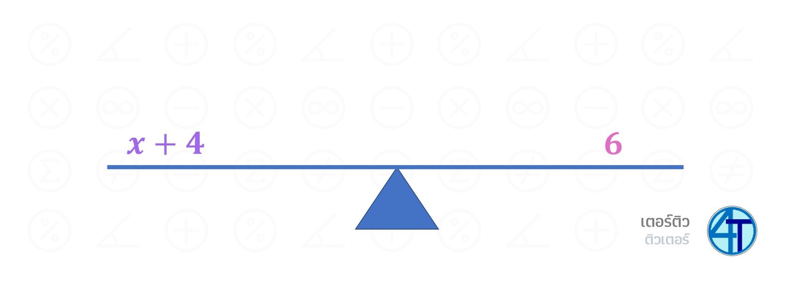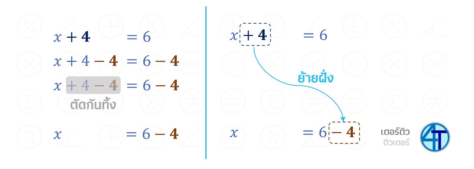 สมมติเรามี \(x+4=6\) เหมือนเดิมครับ สิ่งที่เราจะทำก็คือ นำ \(4\) ไปลบทั้งสองข้างของสมการ จะได้เป็นแบบด้านซ้ายในภาพ