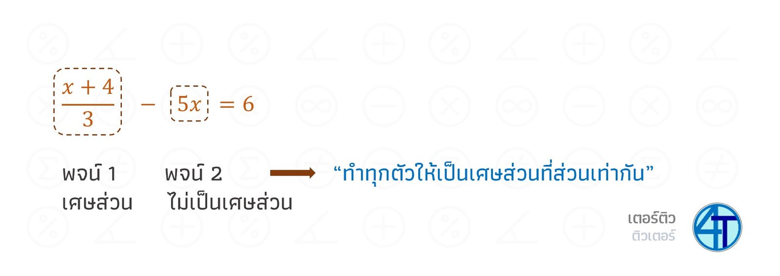 วิธีการแก้สมการแบบนี้ เราจะต้องกำจัดเศษส่วนกันก่อน หรือพูดง่าย ๆ ว่าแปลงให้เหลือบรรทัดเดียวแบบที่น้อง ๆ เคยเจอและแก้สมการกันเป็นแล้วในหัวข้อที่แล้ว หลักการพี่อยากให้น้อง ๆ มองตัวส่วนเป็นก้อนครับ