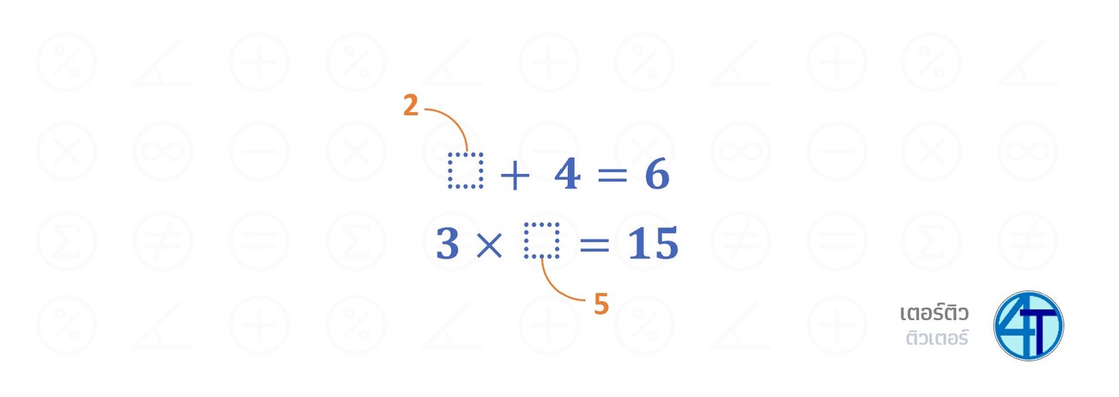 จริง ๆ แล้วในระดับประถมน้อง ๆ ได้เห็นการแก้สมการไปแล้วแบบไม่รู้ตัวครับ หากจำได้น้อง ๆ จะเจอสัญลักษณ์กล่องสี่เหลี่ยมกันแบบด้านล่าง โดยโจทย์จะให้น้อง ๆ เติมตัวเลขในช่องว่างให้ถูกต้อง