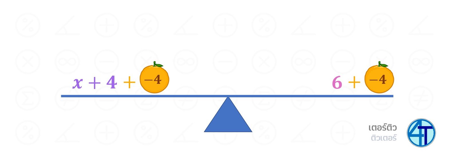 ซึ่งถ้าน้องสังเกตดี ๆ ตัวอย่างด้านบน \(x+4=6\) เราอยากให้พจน์ที่มี \(x\) อยู่โดด ๆ ดังนั้นเราจึงอยากกำจัด \(+4\) ทิ้ง เราจึงจะ บวกด้วย \(-4\) (พูดง่าย ๆ คือ ลบด้วย \(4\) ทั้งสองข้างของสมการ) ดังนั้น